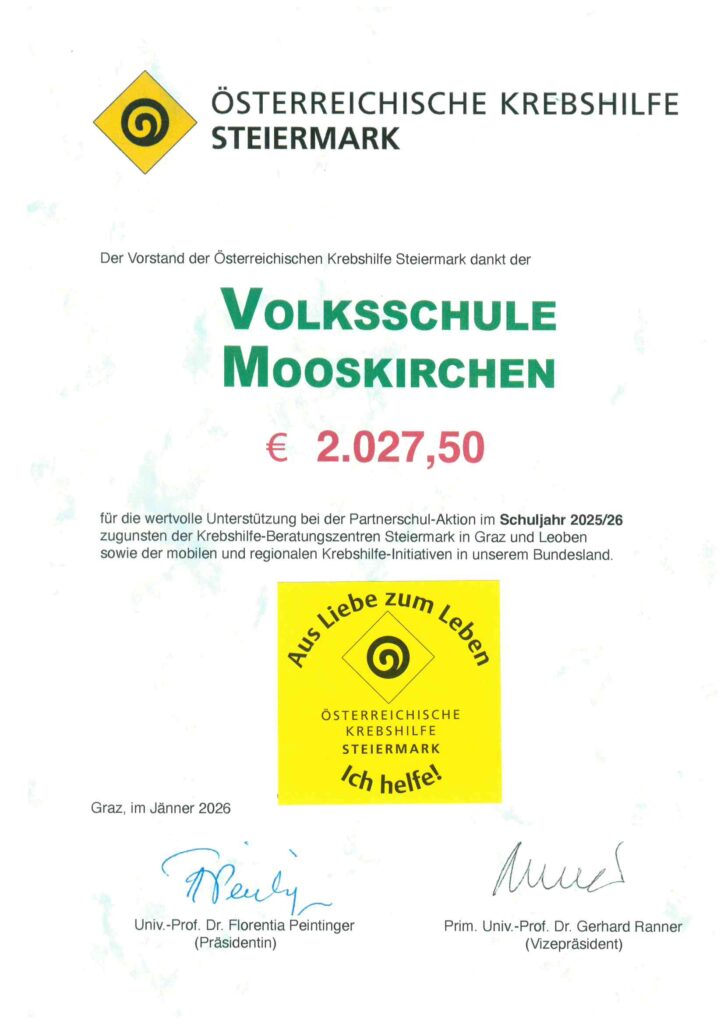 Wieder alle Erwartungen übertroffen hat unser Spendenaufruf für die Österreichische Krebshilfe Steiermark im Jänner 2026: Die Schülerinnen und Schüler der VS Mooskirchen sammelten Spenden in der Höhe von 2027,50 €.